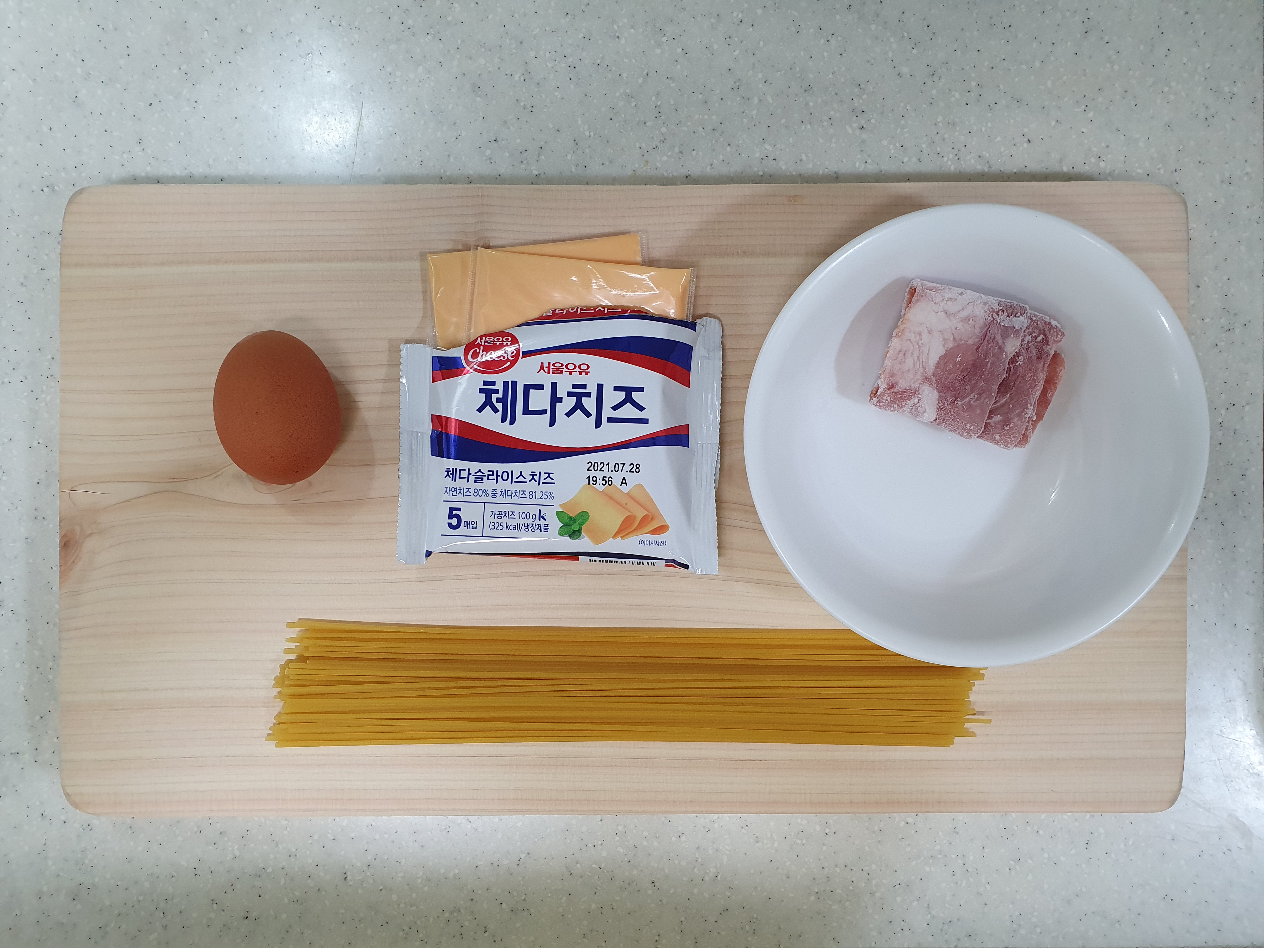 소스 재료 : 체다 치즈(슬라이드) 1장, 계란 1개, 후추
