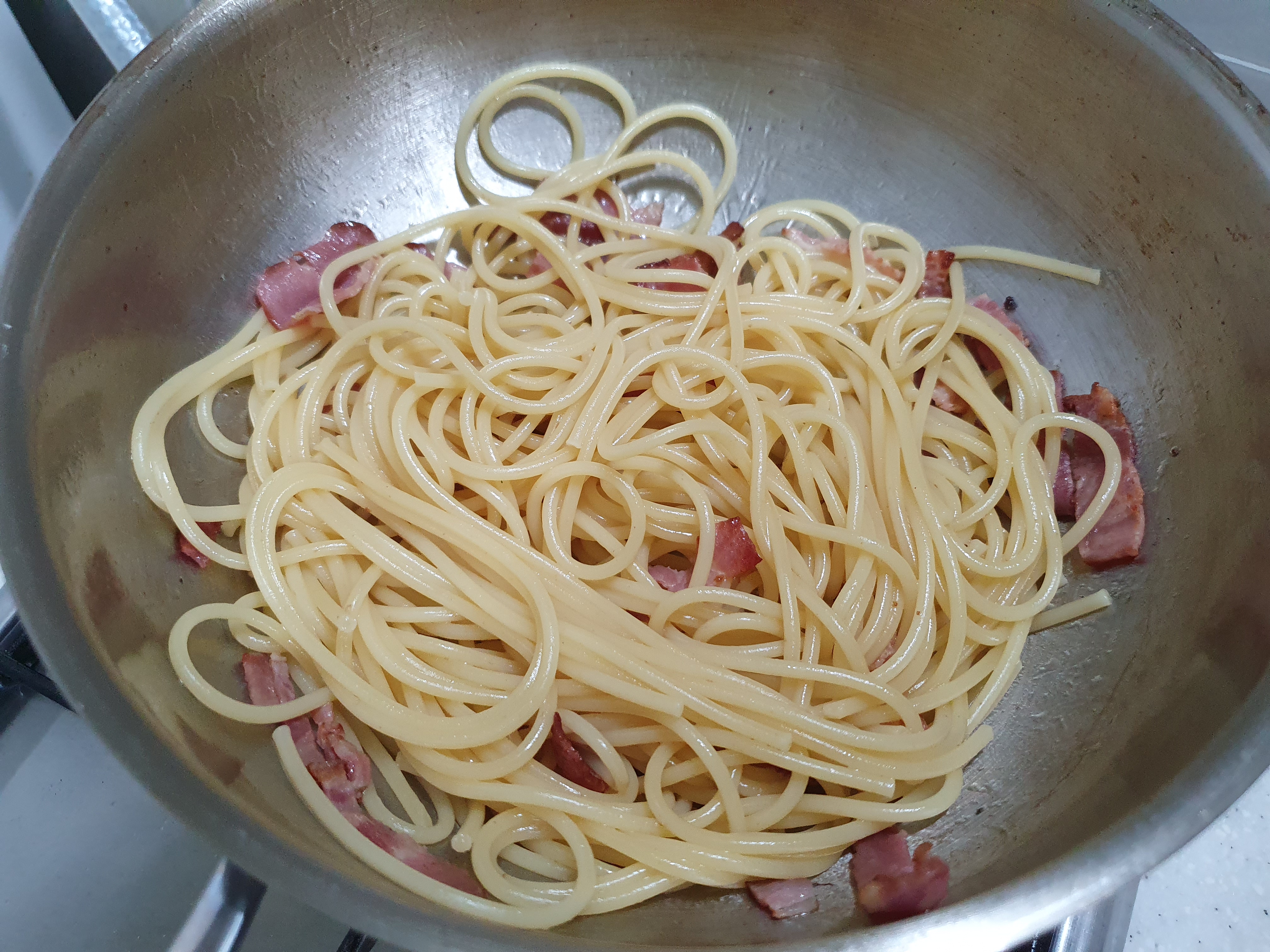 주 재료 : 파스타 80g, 베이컨 2장, 소금