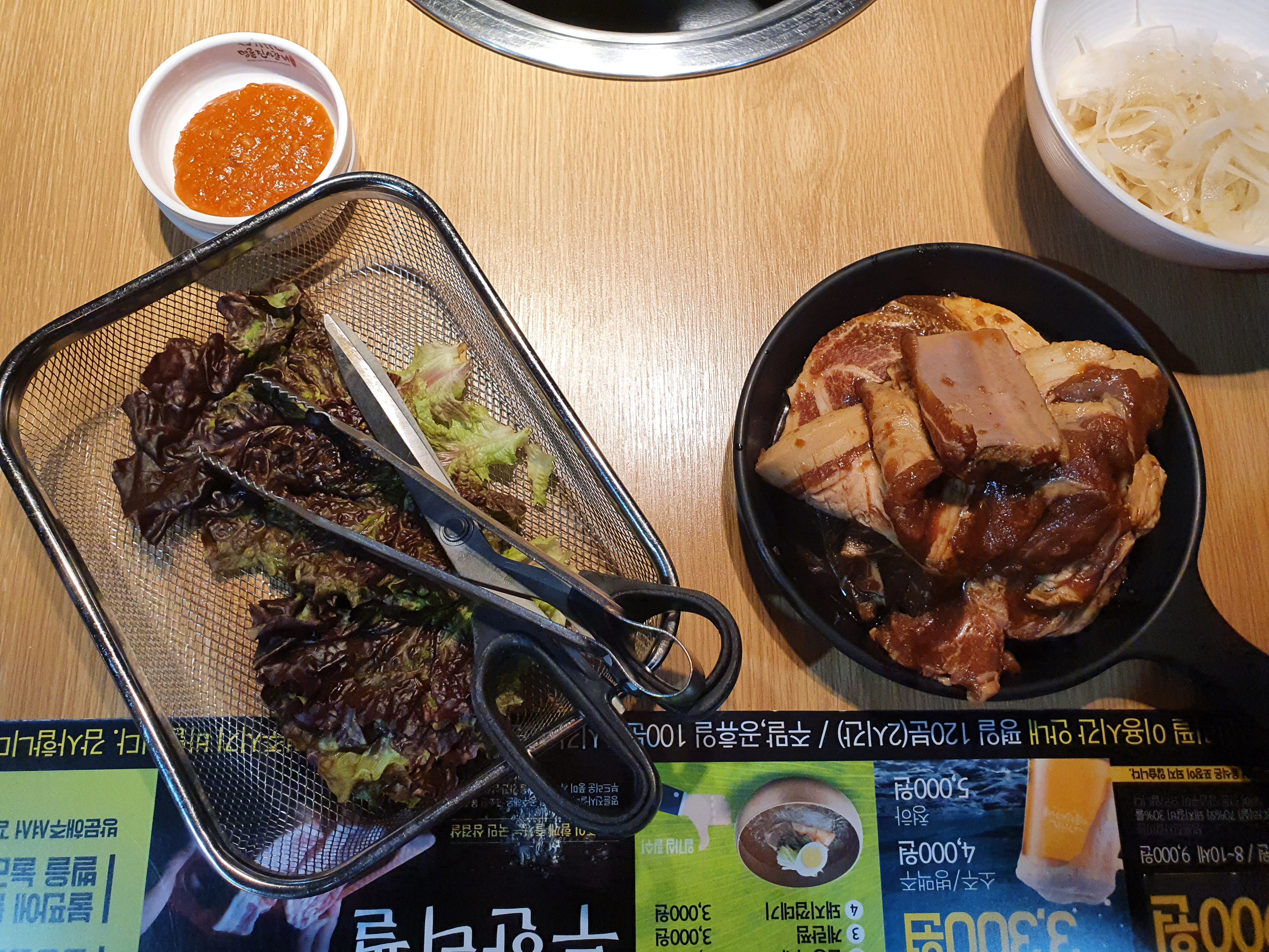 고기, 기본 양파와 쌈장, 상추가 바로 준비됩니다. 그리고 잠시 기다리면 숯을 달궈서 넣어주십니다.