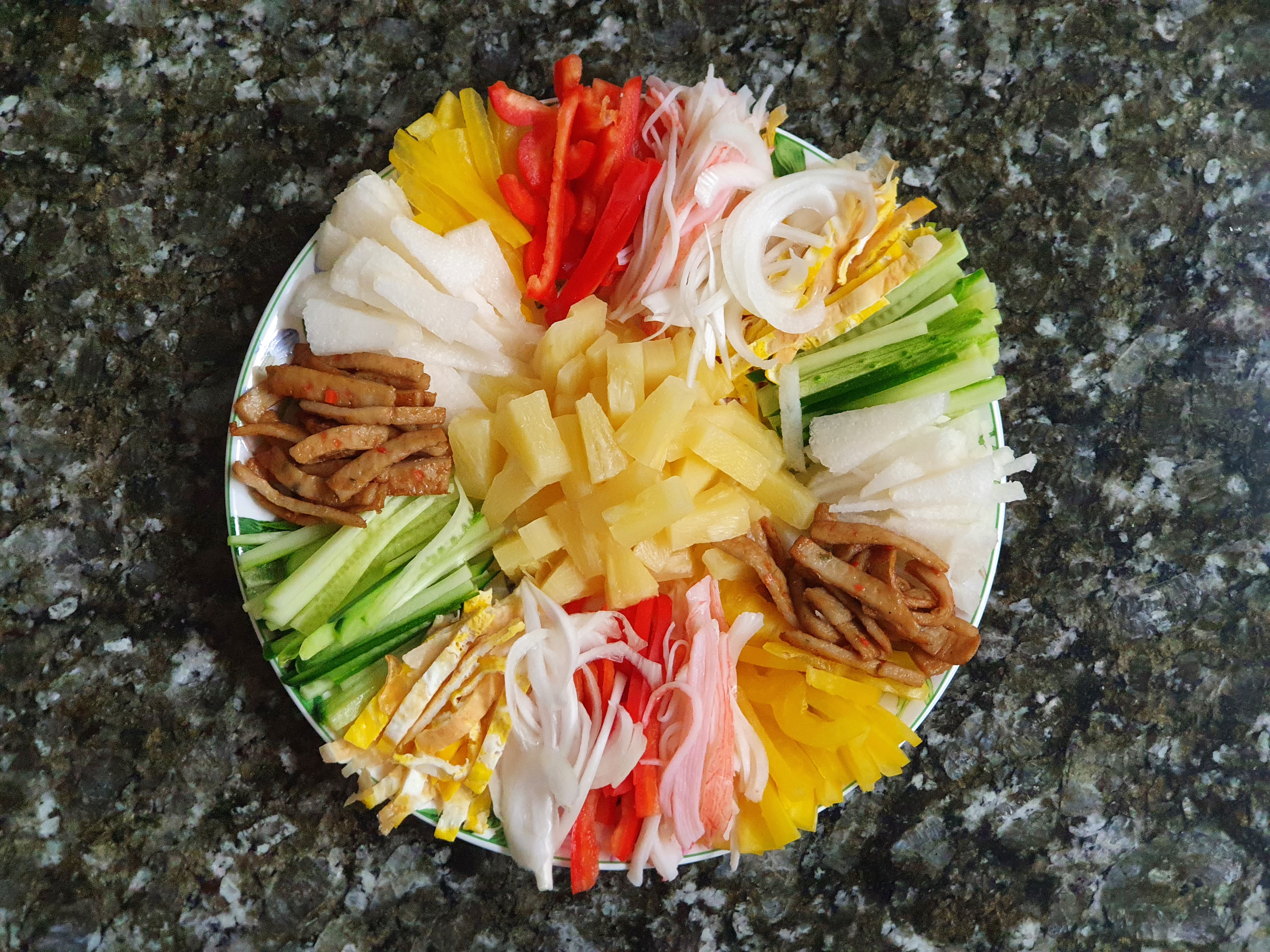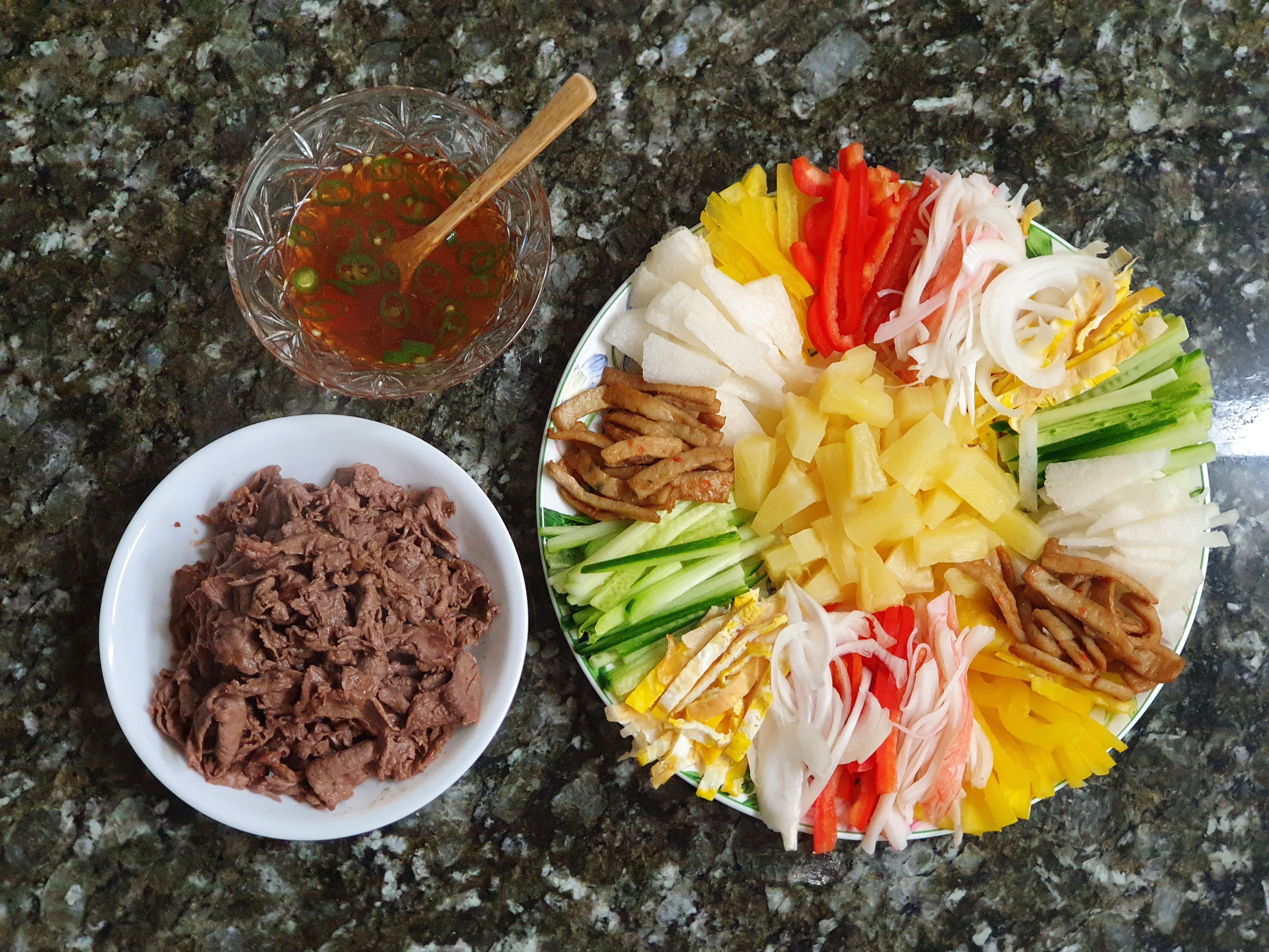 쌈 재료 : 소고기 (우둔불고기) 300g, 계란 2개, 파인애플 통조림(도넛모양기준) 4조각, 파프리카 1.5개, 오이 2/3개, 양파 1/2개, 맛살 3개, 어묵 2장, 배 1/4개, 라이스페이퍼 40장
