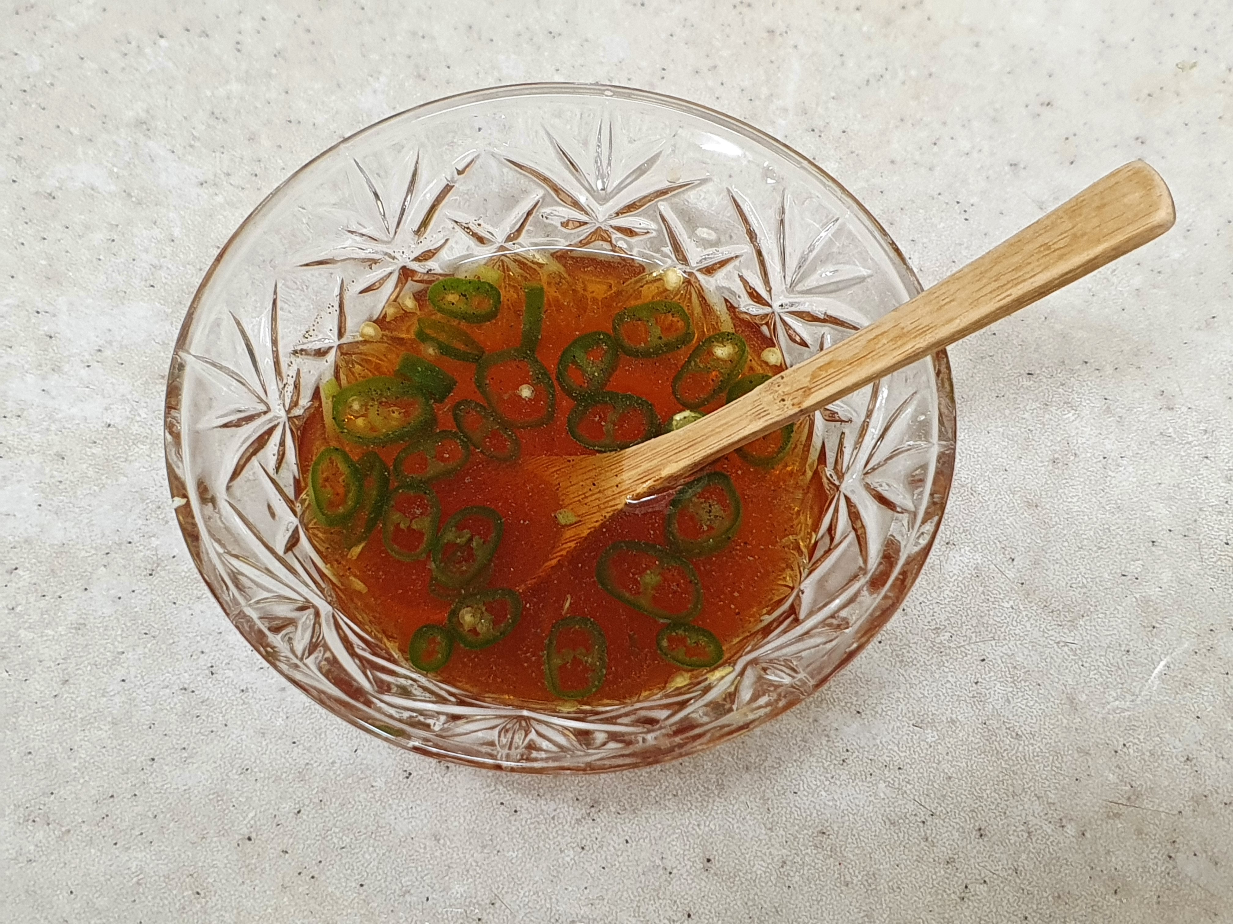 (파인애플 통조림 국물 150ml, 멸치액젓 2T, 간장 1t, 식초 1t, 설탕 1t, 청양고추 1/3개, 다진마늘 1t, 후추 조금)