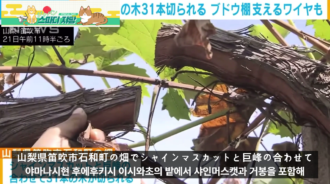 山梨県笛吹市石和町の畑でシャインマスカットと巨峰の合わせて31本の木が切られているのを持ち主の男性が見つけました。