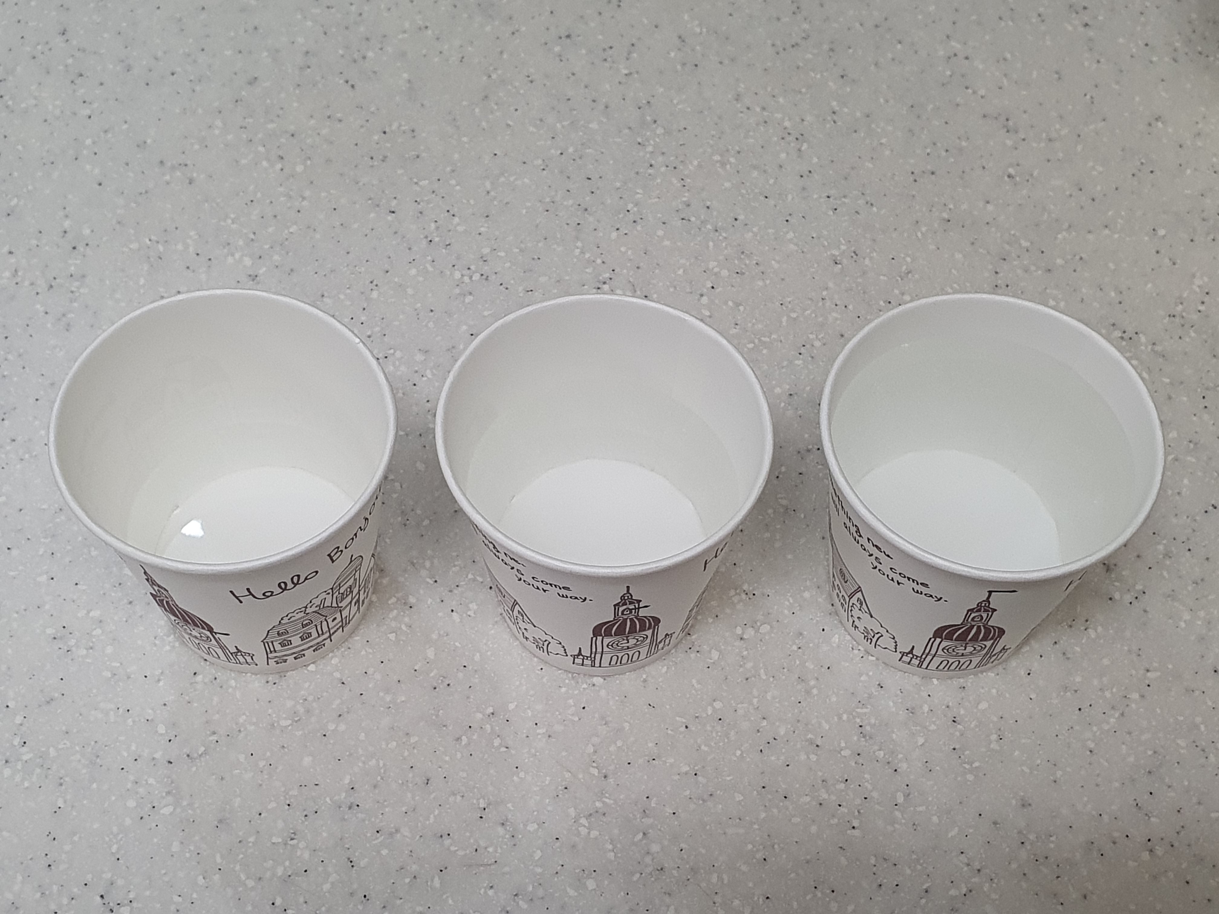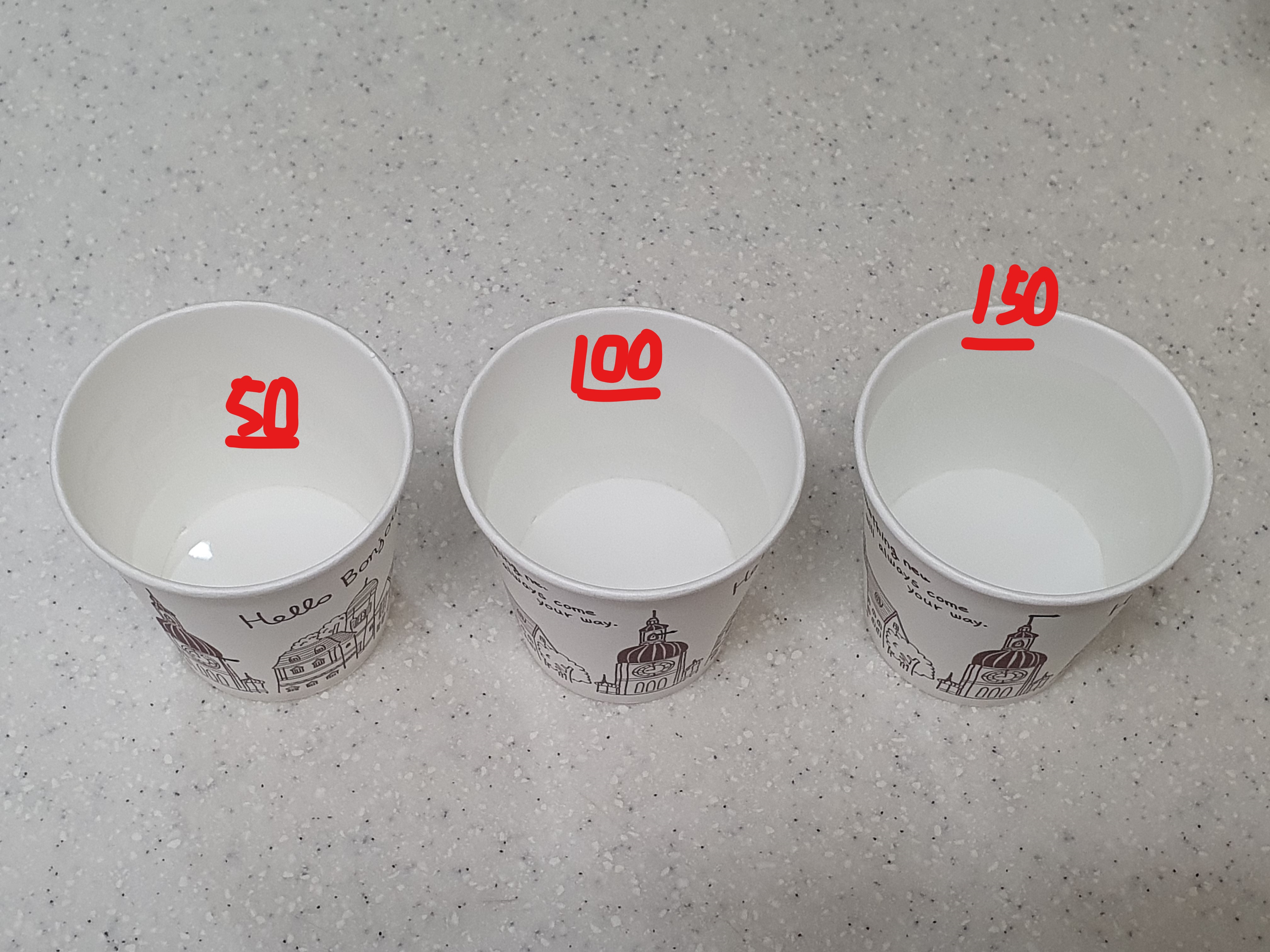 - 50ml ≒ 종이컵 1/3지점 (아래가 부피가 작아 대략 50ml)