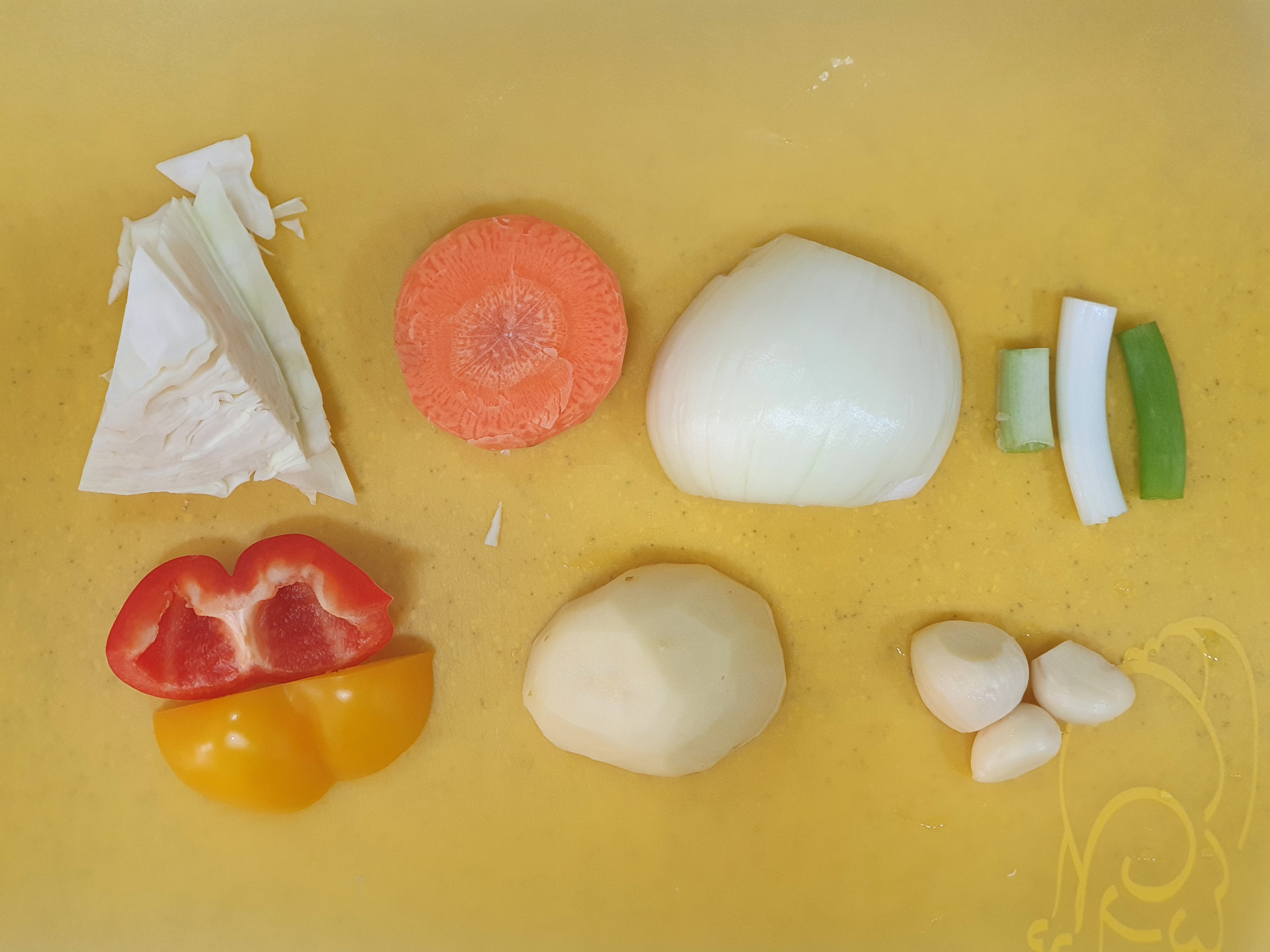 * 나머지 재료는 다른 재료 익히는 동안 손질 가능 ( 양파,마늘,대파 > 양배추, 파프리카 > 햄 )