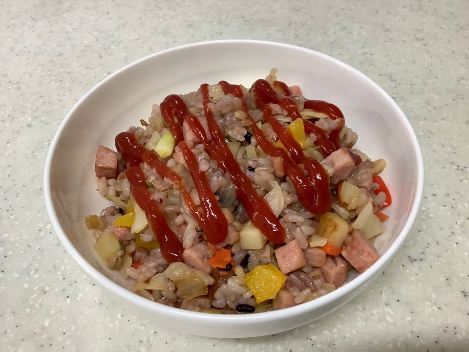 1. 만든 직후는 케찹을 넣는 쪽이 맛있지만, 식은 뒤 데워먹을 때는 햄맛이 많이 우러나와 케찹이 없는 쪽이 더 맛있는 것 같다.