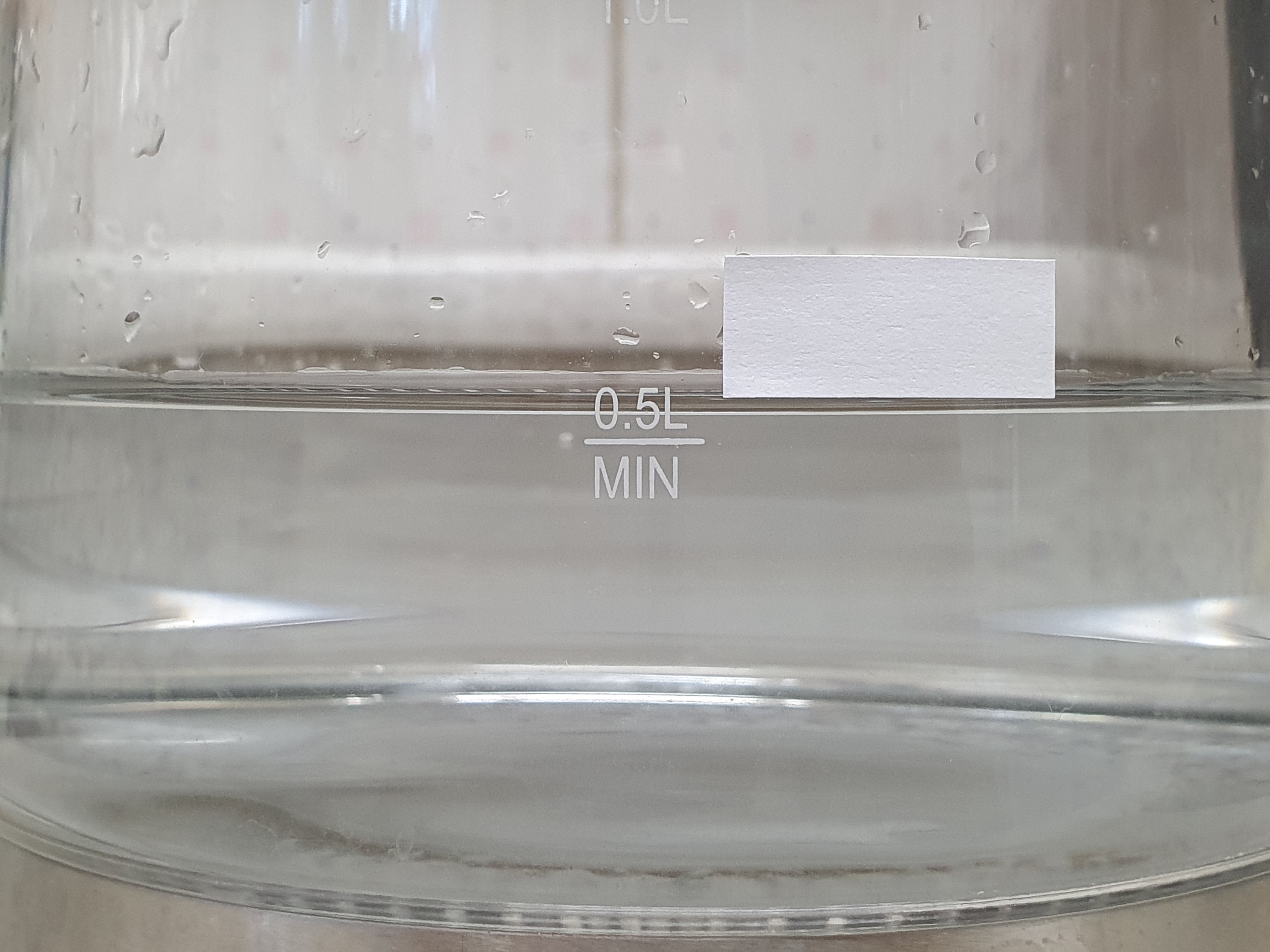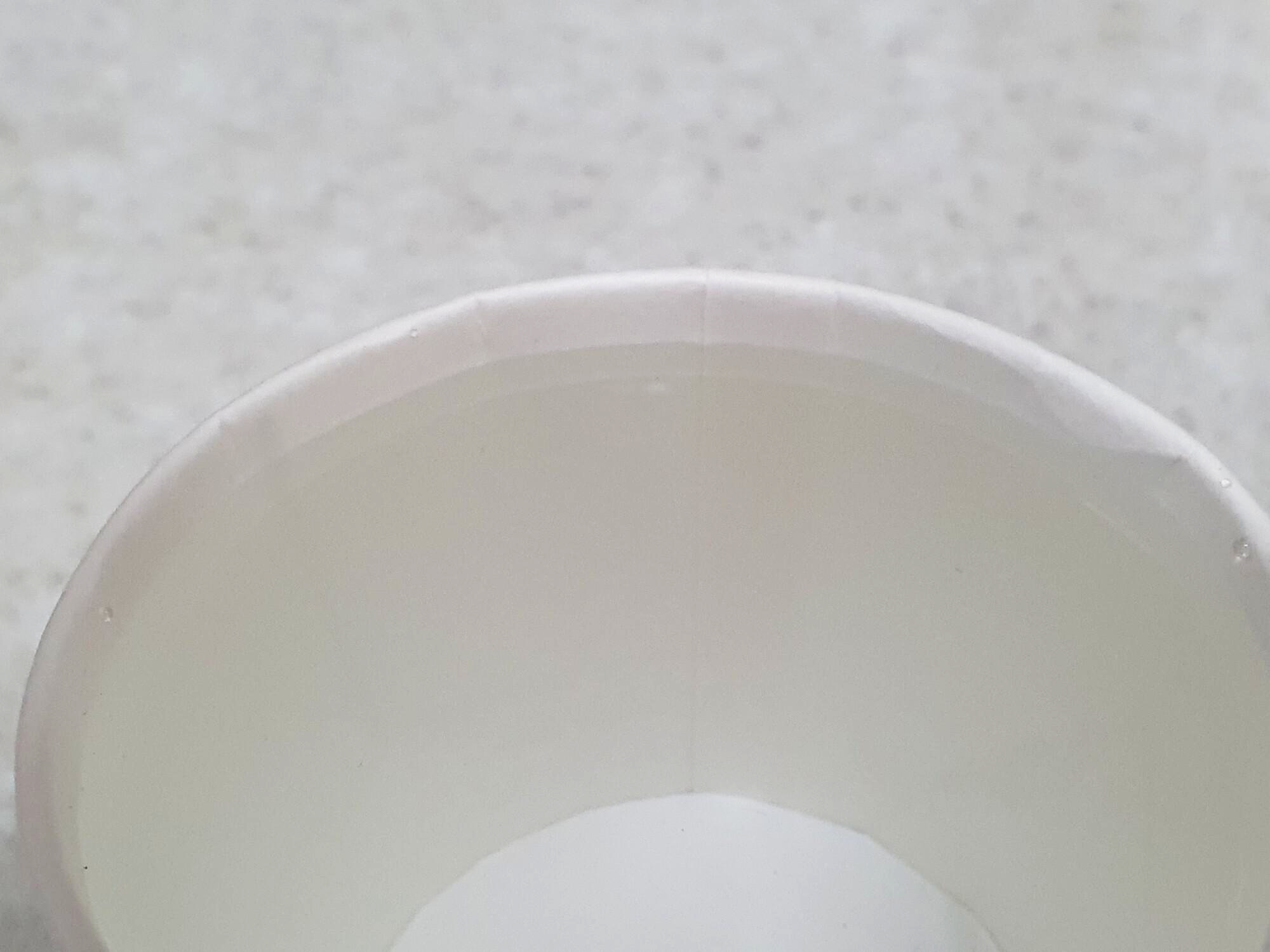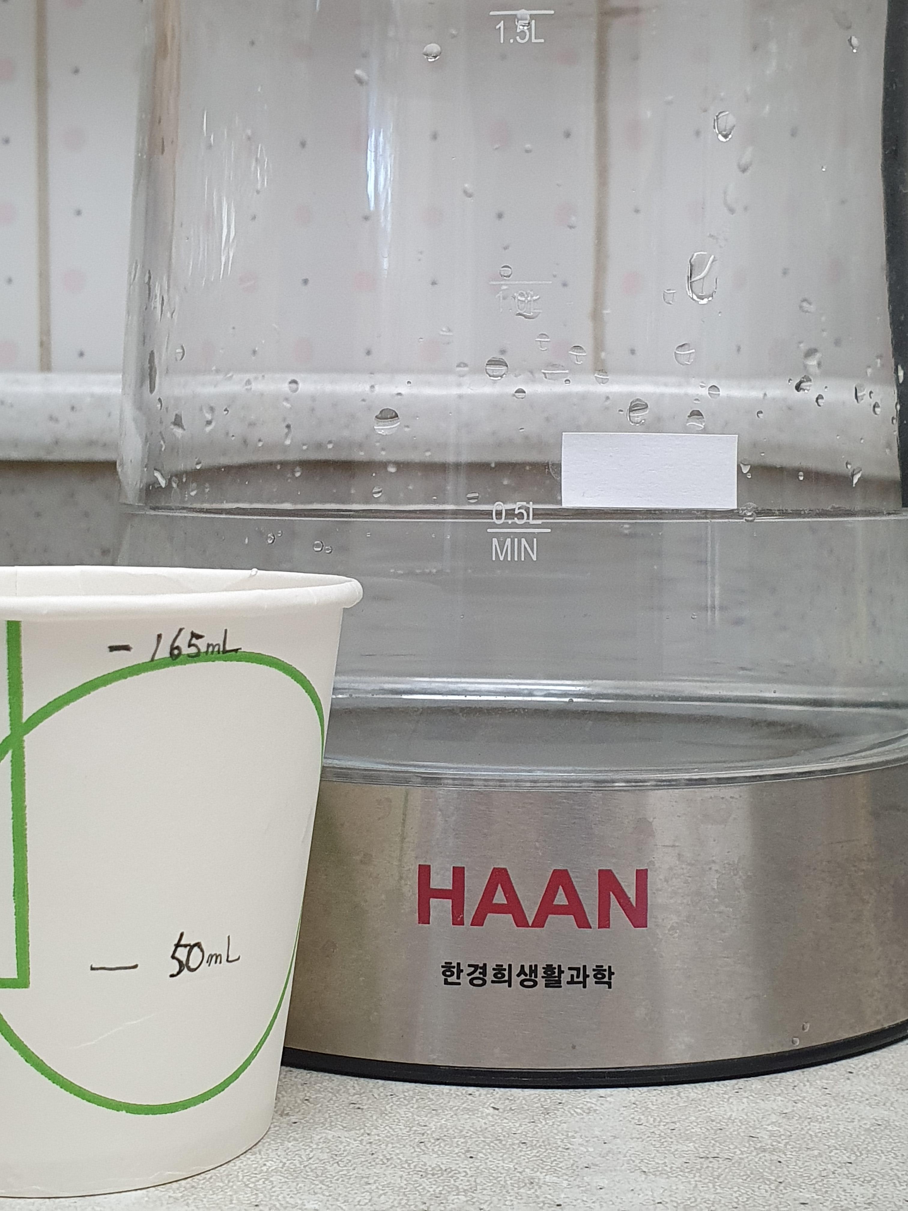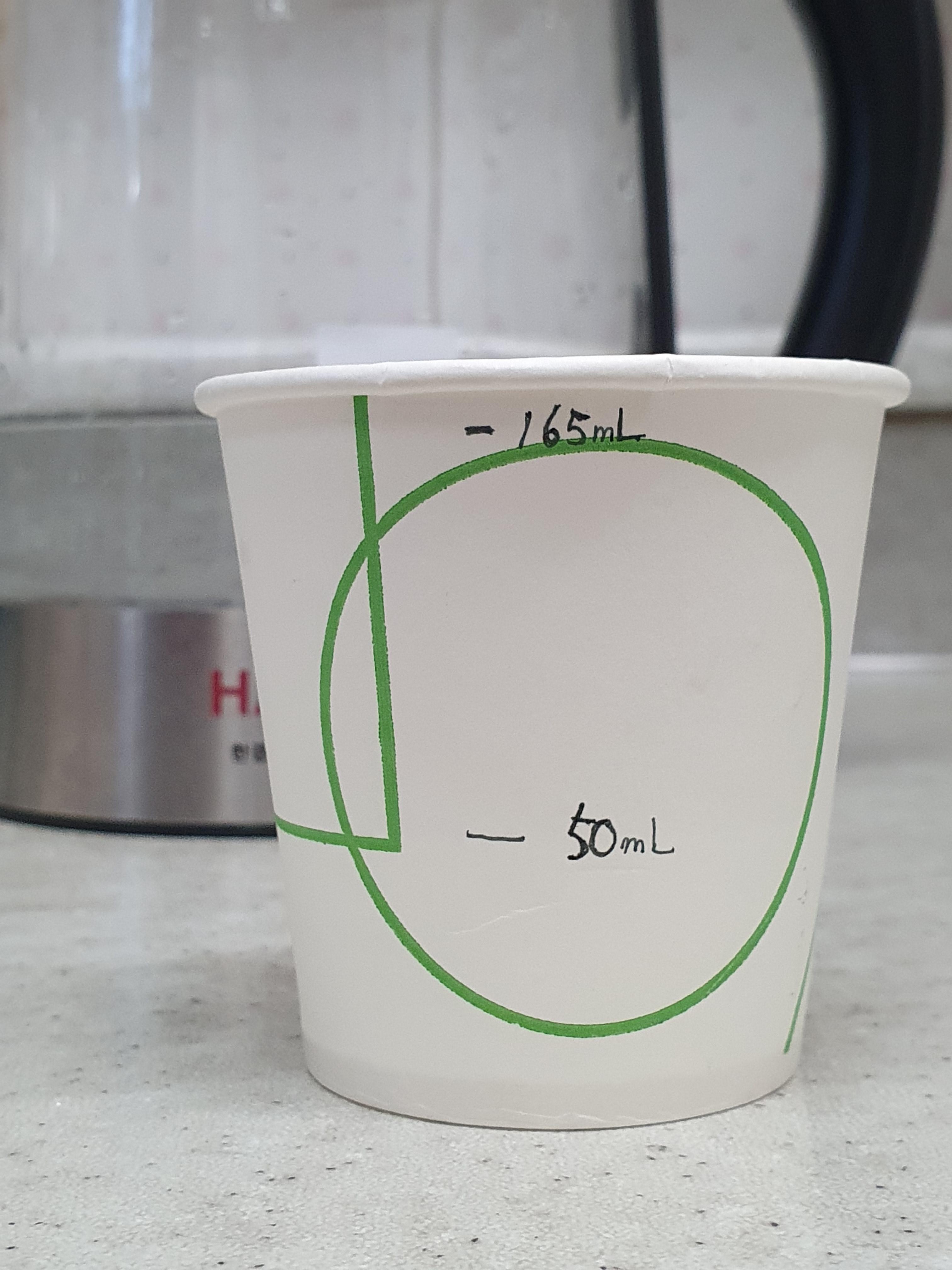 오늘 사용할 종이컵의 용량을 먼저 확인해보겠습니다. 컵을 옮길 때 쏟기지 않을 최대한의 양을 넣으면 165ml가 나옵니다. 세 번 넣으면 165ml * 3 = 495ml이므로, 약 50ml가 부족합니다. 나머지 50ml는 아래와 같이 약 1/3컵 정도 됩니다.