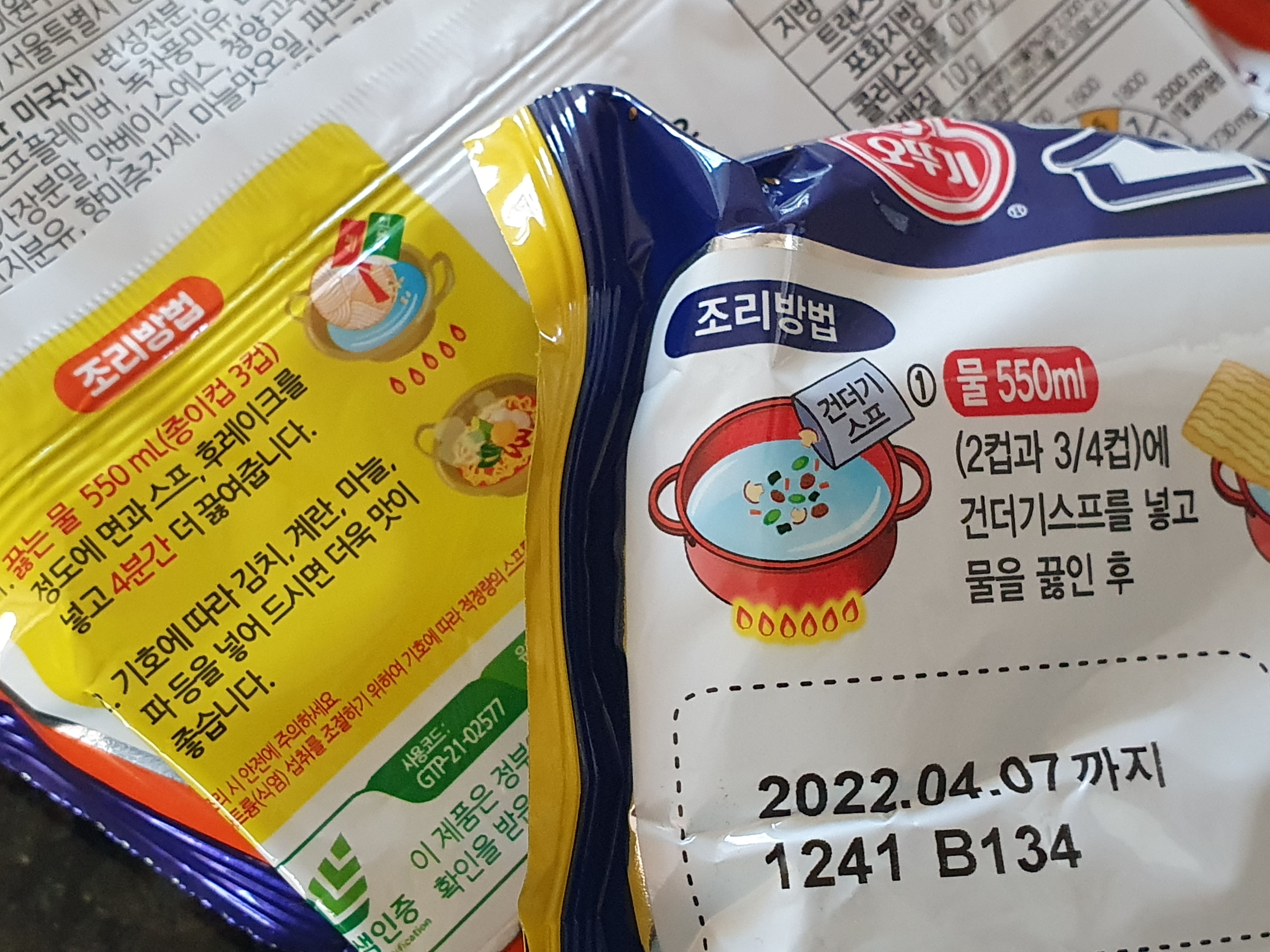 - 라면 1개를 끓일 때 물은 550mL(550cc)를 넣고 끓이라고 되어있습니다.